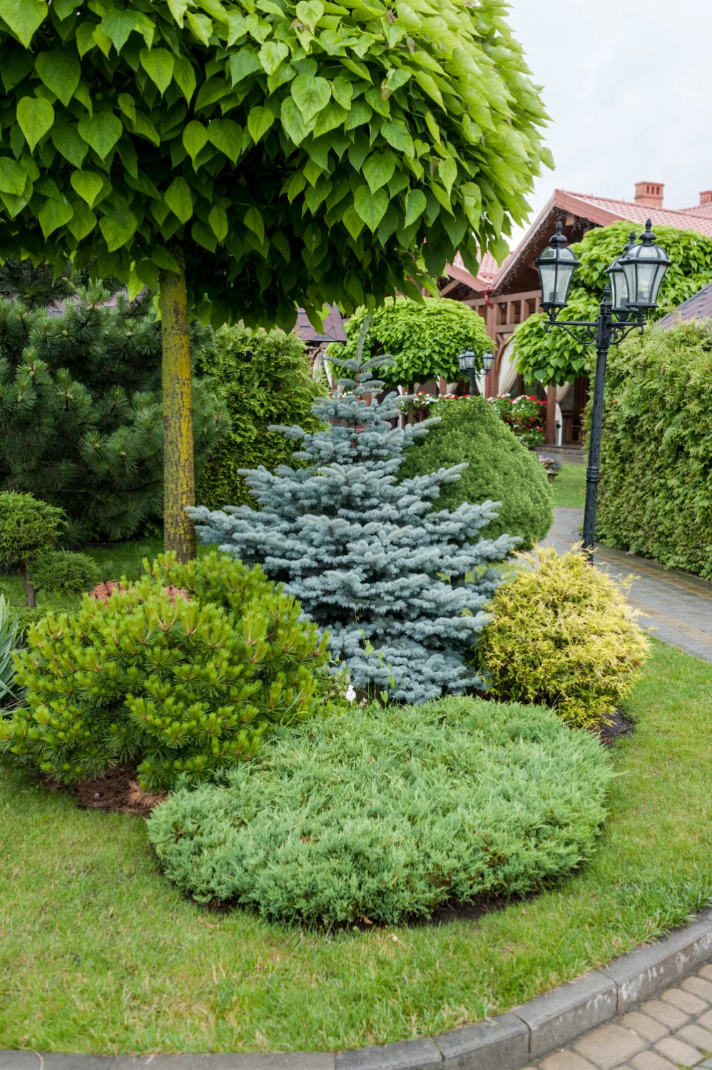 Fák, cserjék és virágágyások telepítése esztétikusan és funkcionálisan.